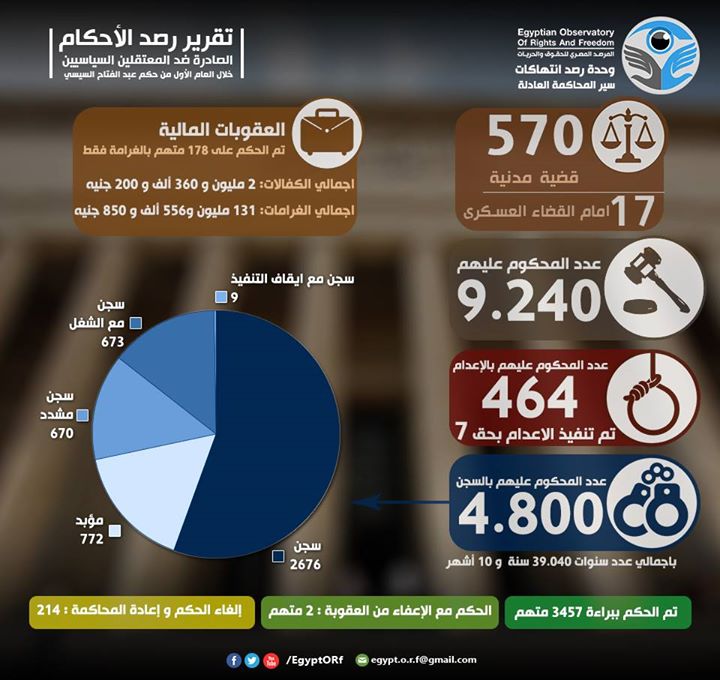 بالإنفوجرافيك.. الحكم على 9240 معارضًا خلال العام الأول من حكم السيسي