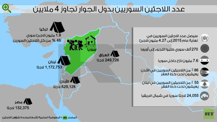 كشفت المفوضية السامية للأمم المتحدة لشؤون اللاجئين، أن عدد اللاجئين السوريين في الدول المجاورة تجاوز 4 ملايين لاجئ، وسيصل إلى 4.27 مليون لاجئ بنهاية عام 2015.