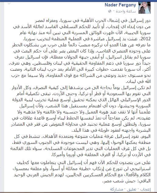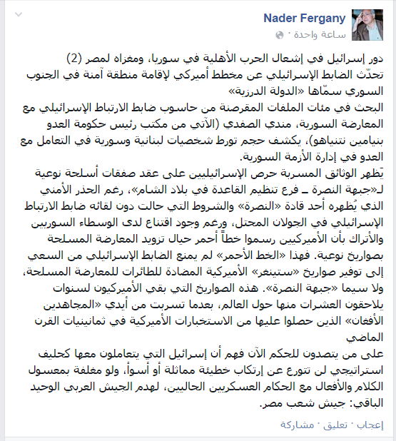 قال الدكتور نادر فرجاني، أستاذ العلوم السياسية بجامعة القاهرة، أن وثائق مسربة بينت أنه منذ نهاية عام 2012، ويد إسرائيل تعبث مباشرة في العملية المنظمة لتخريب سوريا.