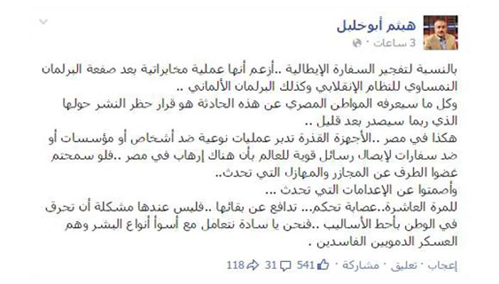وعلق الناشط السياسي هيثم أبو خليل، عل الانفجار بقوله: “بالنسبة لتفجير السفارة الإيطالية.. أزعم أنها عملية مخابراتية بعد صفعة البرلمان النمساوي للنظام الانقلابي وكذلك البرلمان الألماني”.