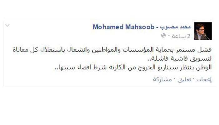 وعلق السياسي الدكتور محمد محسوب -في منشور له على صفحته بالـ”فيس بوك” قائلًا: “فشل مستمر بحماية المؤسسات والمواطنين وانشغال باستغلال كل معاناة لتسويق فاشية فاشلة، الوطن ينتظر سيناريو للخروج من الكارثة”.