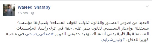 وقال “شرابي”، في منشور له عبر صفحته الرسمية على موقع “فيس بوك”: “العديد من نصوص الدستور والقانون تناولت القوات المسلحة باعتبارها مؤسسة مستقلة، وإصدار السيسي لقانون ينص على حقه في عزل رؤساء المؤسسات المستقلة والرقابية يعني أن هناك تهديدا حقيقيا للفريق صدقي صبحي في منصبه كوزير للدفاع”.