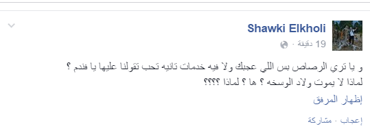 وعلق Shawki Elkholi: “ويا ترى الرصاص بس اللي عجبك ولا فيه خدمات تانية تحب تقولنا عليها يا فندم؟”.