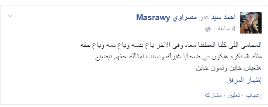وتعجب أحمد سيد قائلًا: “المحامي اللي كلنا اتعطفنا معاه وفي الآخر باع نفسه وباع دمه وباع حقه، منك لله بكره هيكون في ضحايا غيرك وبسبب أمثالك حقهم بيضيع، هتعيش خاين وتمون خاين”.