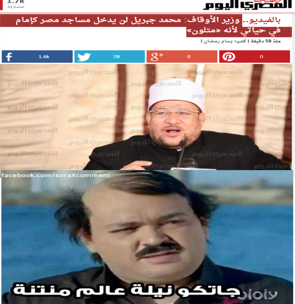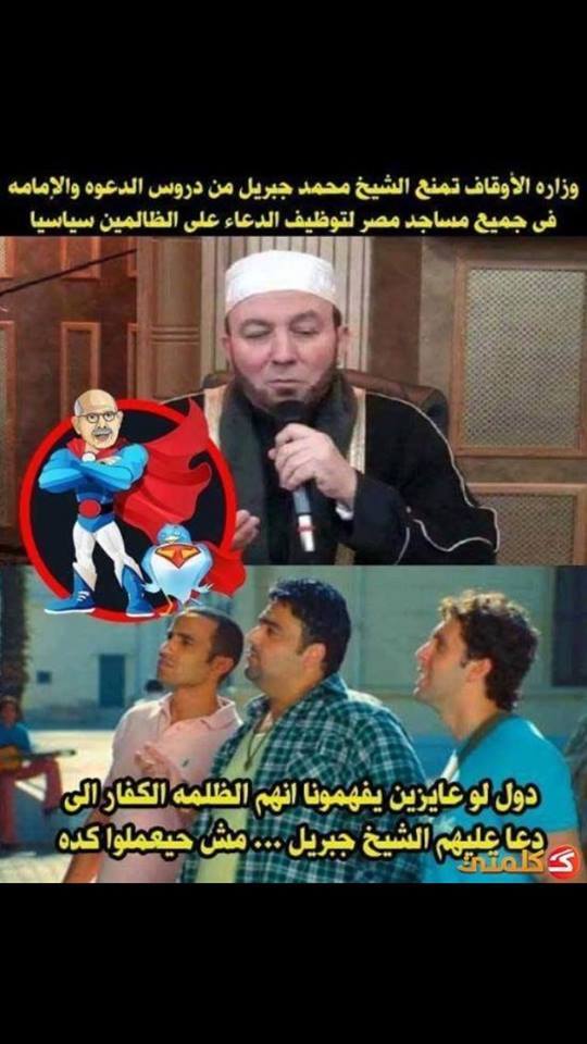 تداول مغردون على مواقع التواصل الاجتماعي عددًا من الكوميكسات الساخرة، تعقيبًا على قرار وزارة الأوقاف منع الشيخ محمد جبريل من اﻹمامة، والتحقيق معه على خلفية دعائه على الظالمين أول من أمس، بمسجد عمرو بن العاص.