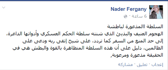 استنكر نادر فرجاني، أستاذ العلوم السياسية، الهجوم الذي شنته السلطات على الشيخ القارئ محمد جبريل، بعد دعائه على الظالمين في ليلة القدر بمسجد عمرو بن العاص، والتي وصلت لمنعه من السفر.