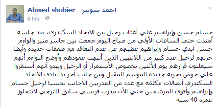 وكتب شوبير -على صفحته الشخصية بموقع التواصل الاجتماعي “فيس بوك”-: “حسام حسن وإيراهيم على أعتاب رحيل من الاتحاد السكندري بعد جلسة امتدت حتى الساعات الأولي من صباح اليوم جمعت بين جاسر منير والتوأم حسن”.