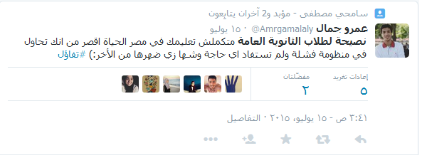 أما عمرو جمال، فقال: “نصيحة لطلاب الثانوية العامة متكملش تعليمك في مصر الحياة اقصر من انك تحاول في منظومة فشلة ولم تستفد أي حاجة وشها زي ضهرها من الآخر تفاؤل”.
