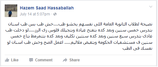 ورفض Hazem Saad Hassaballah إقبال الطلاب أصحاب المجاميع العالية على كلية الطب، وقال: “نصيحة لطلاب الثانوية العامة اللى نفسهم يخشو طب.. خش طب بس طب اسنان بتدرس خمس سنين وبعد كده بتفتح عيادة وبتجيلك فلوس زى الرز.. لو دخلت طب عادى بتدرس سبع سنين وبعد كده سنتين تكليف وبعد كده بتتمرمط بتاع خمس سنين ف مستشفيات الحكومة وبتقبض ملاليم.. اعمل الصح وخش طب اسنان لو نفسك في الطب”.