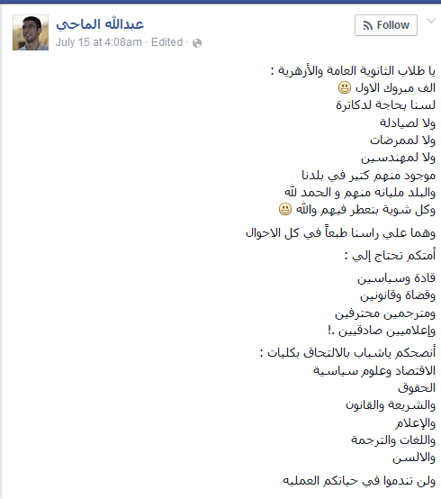 وقال الإعلامي عبد الله الماحي، في تدوينة له عبر حسابه بموقع “فيس بوك”: “يا طلاب الثانوية العامة والأزهرية لسنا بحاجة لدكاترة ولا لصيادلة ولا لممرضات ولا لمهندسين موجود منهم كتير في بلدنا والبلد مليانة منهم والحمد لله وكل شوية بنعطر فيهم والله وهما على راسنا طبعاً في كل الأحوال”.