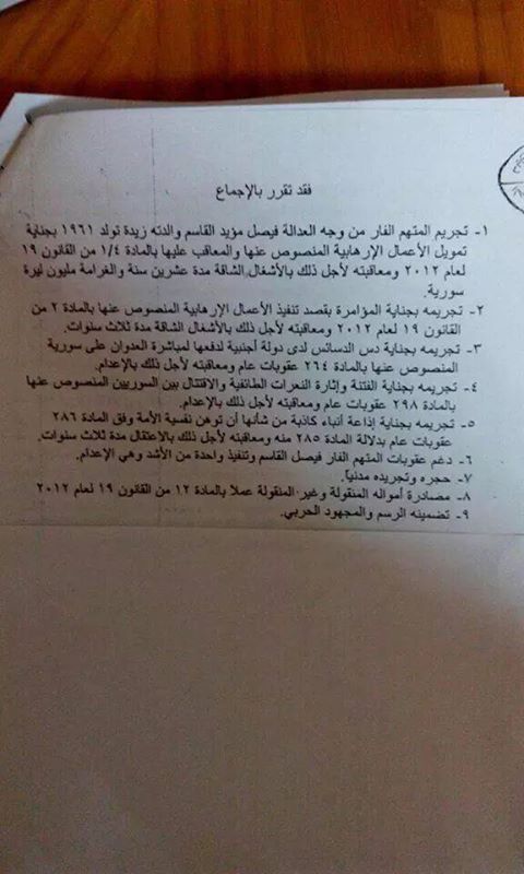 جاء ذلك بحسب وثيقة مسربة نشرتها وسائل إعلام سورية، والتي أبرزت أن القضاء السوري حاكم “القاسم” على عدة تهم مصدرًا عقوبات مختلفة على كل تهمة منها، مقررًا في النهاية تنفيذ العقوبة الأشد فيها وهي الإعدام.