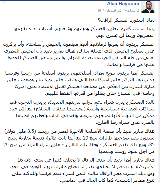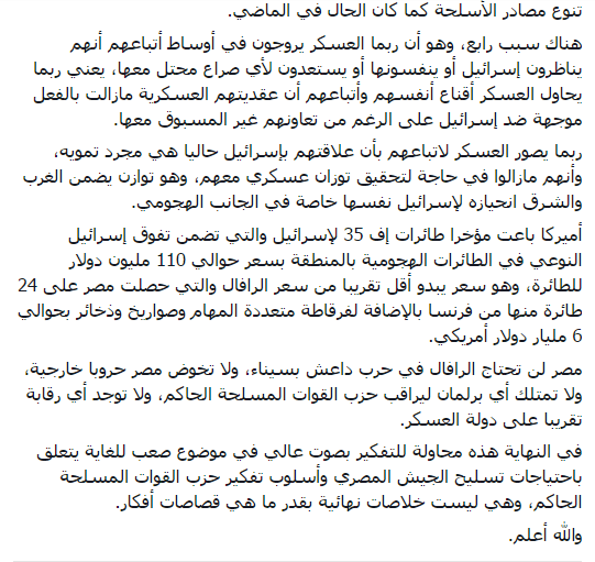 واختتم منشوره قائلًا: “في النهاية هذه محاولة للتفكير بصوت عالٍ في موضوع صعب للغاية يتعلق باحتياجات تسليح الجيش المصري وأسلوب تفكير حزب القوات المسلحة الحاكم، وهي ليست خلاصات نهائية بقدر ما هي قصاصات أفكار”.