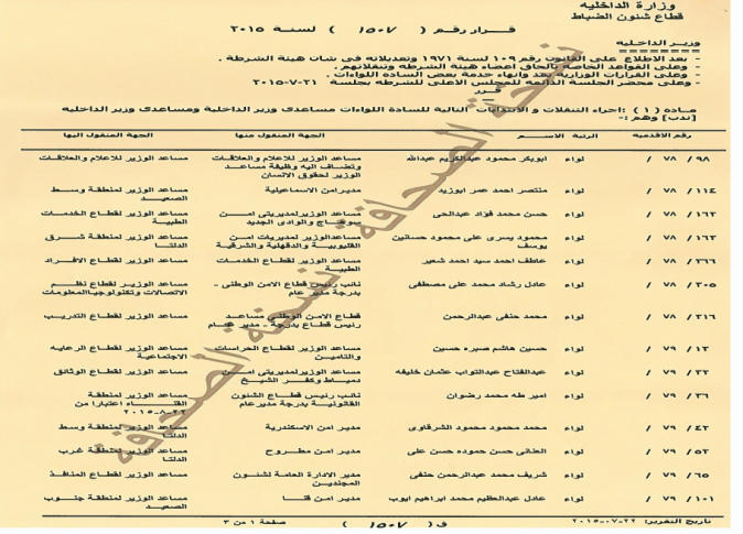 كما تم نقل اللواء عاطف شعير، من مساعد الوزير للخدمات الطبية إلى مساعد الوزير لقطاع الأفراد، ونقل اللواء عادل رشاد من نائب رئيس قطاع الأمن الوطني إلى مساعد الوزير لنظم المعلومات.
