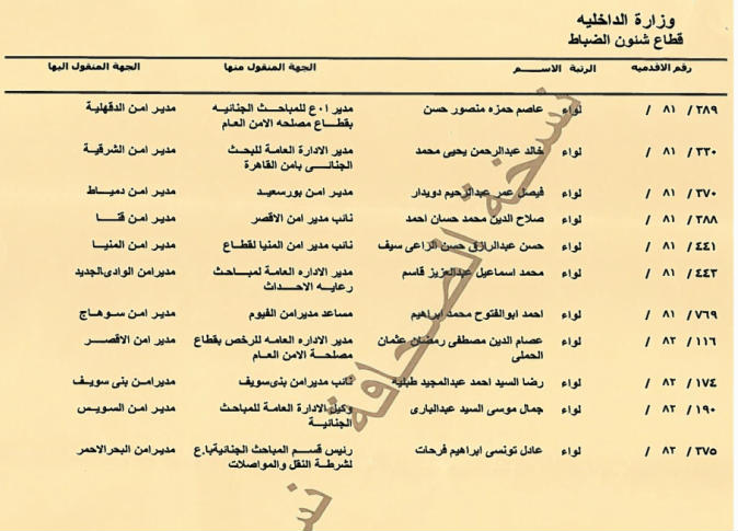 بيما نقل اللواء حسن عبد الحي من مديريتي أمن سوهاج والوادي الجديد إلى قطاع الخدمات الطبية، بالإضافة إلى نقل اللواء محمود يسري، مساعد الوزير لمديريات أمن القليوبية والدقهلية والشرقية إلى رتبة مساعد وزير لمنطقة شرق الدلتا.