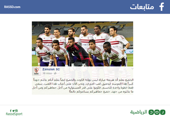 ونشر نادي الزمالك عبر صفحته الرسمية على موقع التواصل الاجتماعي “فيس بوك” منشورًا جاء فيه: “الجميع يعلم أن هزيمة مباراة ليس نهاية الكون، والجميع أيضاً يعلم أنكم بذلتم جهداً كبيراً هذا الموسم لتحقيق لقب الدوري، ونحن الآن على أعتاب هذا اللقب، يتبقى فقط خطوة واحدة للحسم، فكونوا على قدر المسؤولية من أجل جماهيركم ومن أجل ما بذلتوه من جهد، جميع جماهيركم يساندونكم دائماً!”.