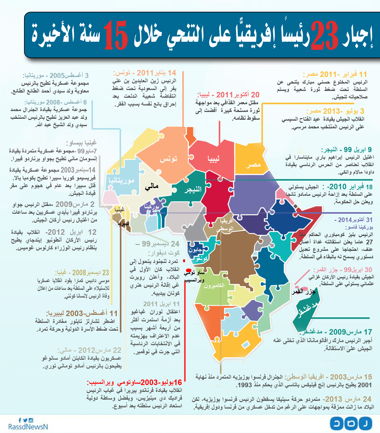 فبداية من اغتيال رئيس النيجر في عام 1999 ومرورًا بثورات الربيع العربي التي طالت بلدين إفريقيين كبيرين هما مصر وليبيا، وانتهاء باستقالة رئيس بوركينا فاسو العام الماضي بعد احتجاجات شعبية، تلك نماذج من حالات الاضطراب السياسي التي أدت إلى تغيير في السلطة السياسية في الدول الإفريقية خلال 15 عامًا مضت.