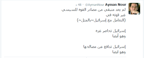 وقال نور عبر “تويتر”: “لم يعد متبقيا من مصادر القوه للسيسي غير قوته في التعامل مع إسرائيل بالمثل”.