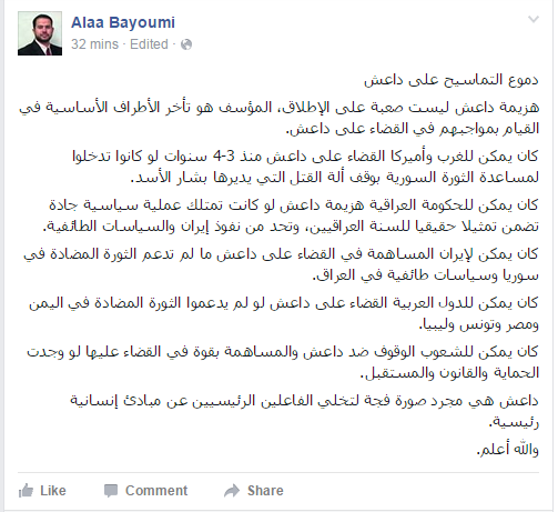 وختم “بيومي”منشوره : “كان يمكن للشعوب الوقوف ضد داعش والمساهمة بقوة في القضاء عليها لو وجدت الحماية والقانون والمستقبل”، معتبرا أن داعش هي مجرد صورة فجة لتخلي الفاعلين الرئيسيين عن مبادئ إنسانية رئيسية، بحسب ما قال.