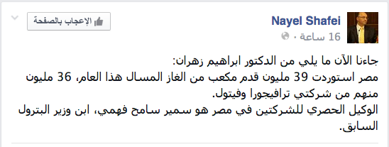 قال نائل الشافعي، مؤسس موسوعة المعرفة، “وصلتني معلومات تفيد أن نجل سامح فهمي، وزير البترول الأسبق في عهد المخلوع مبارك، هو أحد موردي الغاز المسال إلى مصر”.
