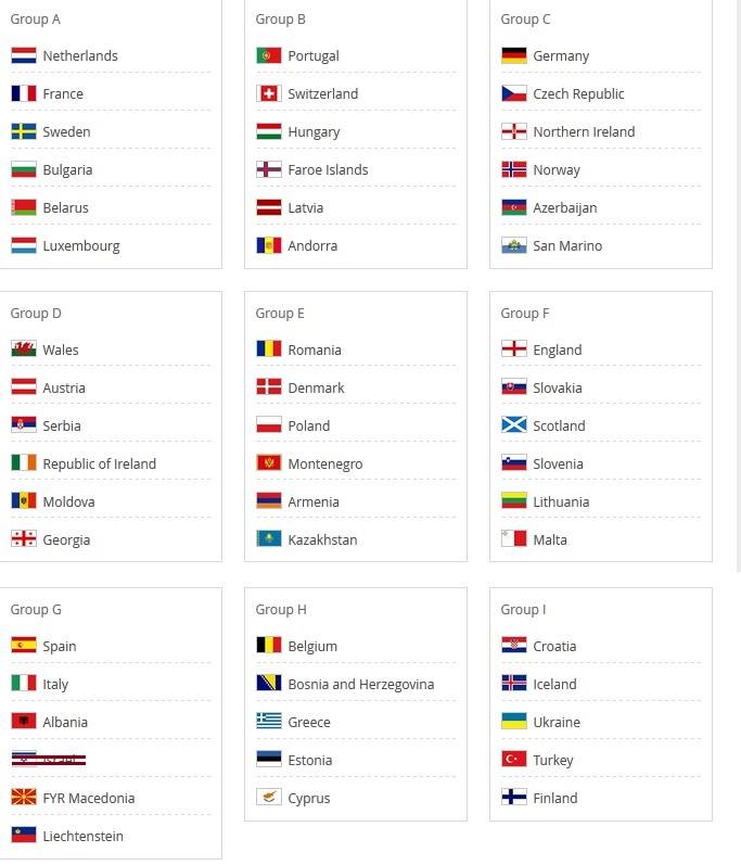 وأسفرت قرعة التصفيات الأوروبية عن المجموعات التالية: