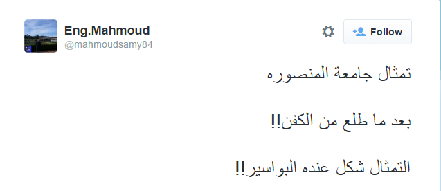 وعلق Eng.Mahmoud “تمثال جامعة المنصورة بعد ما طلع من الكفن!! التمثال شكل عنده البواسير!!”.