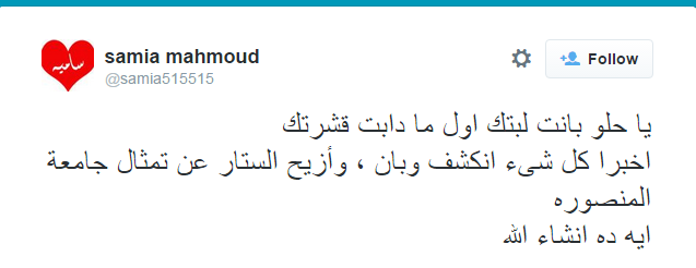 وعلقت samia Mahmoud قائلة “يا حلو بانت لبتك أول ما دابت قشرتك.. أخيرا كل شىء انكشف وبان، وأزيح الستار عن تمثال جامعة المنصورة.. ايه ده انشاء الله”.