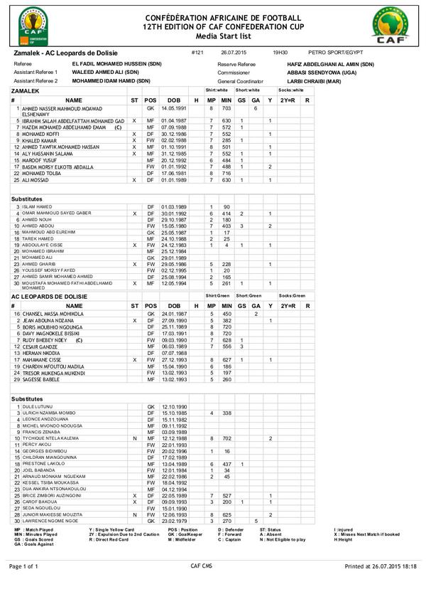 أحرز هدف الزمالك الأول اللاعب باسم مرسي في الدقيقة 2، ليزيد زميله أحمد حفني من جراح الفريق الكونغولي ويحرز الهدف الثاني في الدقيقة 36 من ركلة جزاء.