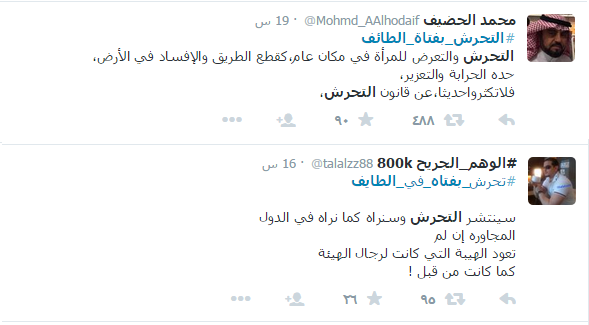 من جانبه، قال المواطن السعودي محمد الحضيف Mohmd_AAlhodaif: “إن التحرش والتعرض للمرأة في مكان عام، كقطع الطريق والإفساد في الأرض، حده الحرابة والتعزير، فلا تكثروا حديثا عن قانون التحرش”، بينما ذكر حساب يُدعي الوهم- الجريح: “سينتشر التحرش وسنراه كما نراه في الدول المجاورة إن لم تعد الهيبة التي كانت لرجال هيئة الأمر بالمعروف والنهي عن المنكر كما كانت من قبل”.
