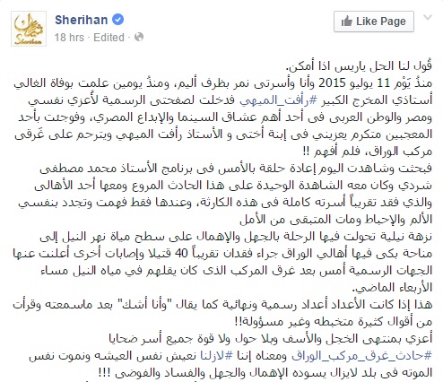 وقالت شريهان في منشور منسوب لها عبر صفحتها الرسمية على موقع التواصل الاجتماعي “فيس بوك”: “منذُ يَوْم 11 يوليو 2015 وأنا وأسرتي نمر بظرف أليم، ومنذُ يومين علمت بوفاة الغالي أستاذي المخرج الكبير رأفت الميهي فدخلت لصفحتي الرسمية لأُعزي نفسي ومصر والوطن العربي في أحد أهم عشاق السينما والإبداع المصري، وفوجئت بأحد المعجبين متكرم يعزيني في ابنة أختي والأستاذ رأفت الميهي ويترحم على غَرقى مركب الوراق، فلم أفهم!”.