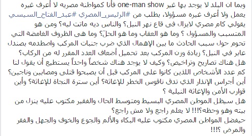 ووجهت بعد ذلك عدة تساؤلات لعبد الفتاح السيسي قائد الانقلاب العسكري، قائلة: “وبما أن البلد لا يوجد بها غير one-man show فأنا كمواطنة مصرية لا أعرف غيره يعمل ولا أعرف غيره مسؤولا، باطلب من عبدالفتاح السيسي يقول لي كام مصري لا يزال في قاع نهر النيل؟ والناس دي ماتت ليه؟ ومن هو المتسبب والمسؤول؟ وما هو العقاب وما هو الحلّ؟ وما هي الظروف الغامضة التي تحوم حول سبب الحادث ما بين الإهمال الذي ضرب جنبات المركب واصطدامه بصندل عابر في النيل؟ زيادة وزن المركب بعد تحميل أضعاف العدد المقرر له من الركاب؟ هل هناك تصاريح وتراخيص؟ وكيف لا يوجد هناك شخص واحد يستطيع أن يقول لنا كم عدد الأشخاص الذين كانوا على المركب قبل أن يصبحوا قتلى ومصابين وناجين؟ أين أجراس الإنذار الذي تدق ناقوس الخطر للإغاثة؟ أين سترة النجاة للإغاثة؟ وأين قوارب الأمن والإغاثة النيلية؟”.