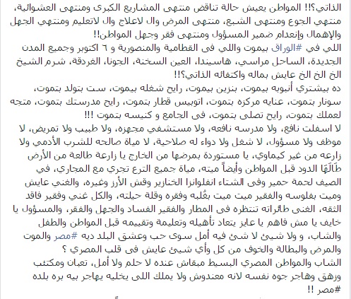 واستنكرت شريهان تدهور أوضاع المواطن المصري: “المواطن يعيش حالة تناقض منتهى المشاريع الكبرى ومنتهى العشوائية، منتهى الجوع ومنتهى الشبع، منتهى المرض واللا علاج واللا تعليم ومنتهى الجهل والإهمال وانعدام ضمير المسؤول ومنتهى فقر وجهل المواطن، اللي في الوراق بيموت واللي في القطامية والمنصورية و٦ أكتوبر وجميع المدن الجديدة، الساحل مراسي، هاسيندا، العين السخنة، الجونا، الغردقة، شرم الشيخ الخ الخ الخ عايش بماله واكتفائه الذاتي؟”.