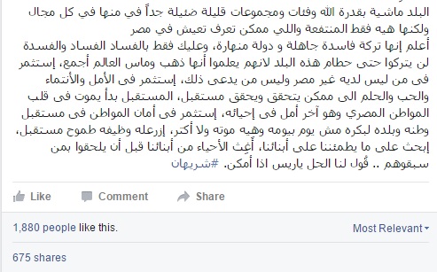 واختتمت شريهان منشورها بقولها: “البلد ماشية بقدرة الله وفئات ومجموعات قليلة ضئيلة جداً في منها في كل مجال ولكنها هيه فقط المنتفعة واللي ممكن تعرف تعيش في مصر، أعلم إنها تركة فاسدة جاهلة و دولة منهارة، وعليك فقط بالفساد الفساد والفسدة لن يتركوا حتى حطام هذه البلد لانهم يعلموا أنها ذهب وماس العالم أجمع، استثمر في من ليس لديه غير مصر وليس من يدعى ذلك، استثمر في الأمل والانتماء والحب والحلم الى ممكن يتحقق ويحقق مستقبل، المستقبل بدأ يموت في قلب المواطن المصري وهو آخر أمل في إحيائه، استثمر في أمان المواطن في مستقبل وطنه وبلده لبكره مش يوم بيومه وهيه موته ولا أكتر، إزرعله وظيفه طموح مستقبل، ابحث على ما يطمئننا على أبنائنا، أَغِث الأحياء من أبنائنا قبل أن يلحقوا بمن سبقوهم .. قُول لنا الحل ياريس إذا أمكن”.