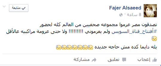 وقالت -عبر منشو لها على “فيس بوك”-: “تصدقون مصر عزموا مجموعة صحفيين من العالم كله لحضور افتتاح قناة السويس، ولم يعزموني!!!!!!!!! ولا حتى عزومة مراكبية عالأقل”.