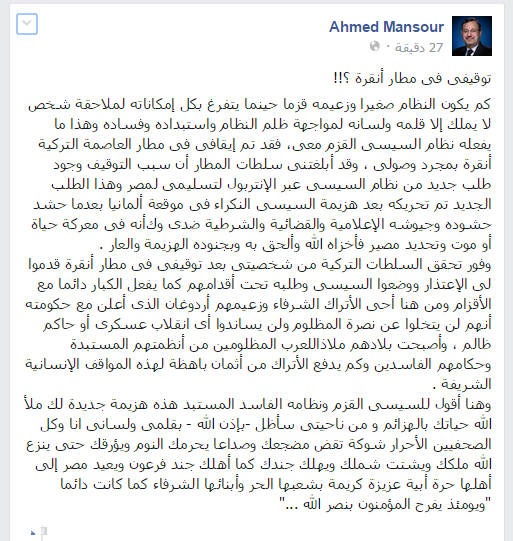 وأعلن “منصور”، في منشور من خلال حسابه الرسمي على موقع “فيس بوك”، أنه تم إيقافه في مطار العاصمة التركية أنقرة بمجرد وصوله، حيث أبلغته سلطات المطار أن سبب التوقيف وجود طلب جديد من نظام السيسي عبر الإنتربول لتسليمه لمصر، وهذا الطلب الجديد تم تحريكه بعد هزيمة السيسي النكراء في موقعة ألمانيا بعدما حشد حشوده وجيوشه الإعلامية والقضائية والشرطية ضدى، وكأنه في معركة حياة أو موت وتحديد مصير، فأخزاه الله وألحق به وبجنوده الهزيمة والعار”.