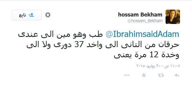 نشر إبراهيم سعيد، لاعب الزمالك ومنتخب مصر سابقا، صورة تسخر من مشجعي النادي الأهلي، مستخدمًا صورا تجمع عبد الفتاح السيسي بأسر قتلى من القوات المسلحة، إذ قام بنشرها على موقع التواصل الاجتماعي “تويتر” بألفاظ خارجة لتنهال الشتائم والسب عليه.