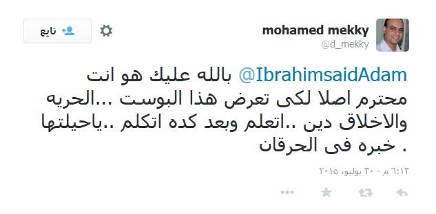 وعاد سعيد بتدوينة على “تويتر” ليرد على من سبه قائلا: “دي صفحتي الشخصية، وليّ حق أنزل أي حاجة بتعجبني، وأتكلم وأكتب براحتي ماحدش هيقول لي أكتب إيه وأنزل إيه، مش على مزاجكم على مزاجي أنا”.