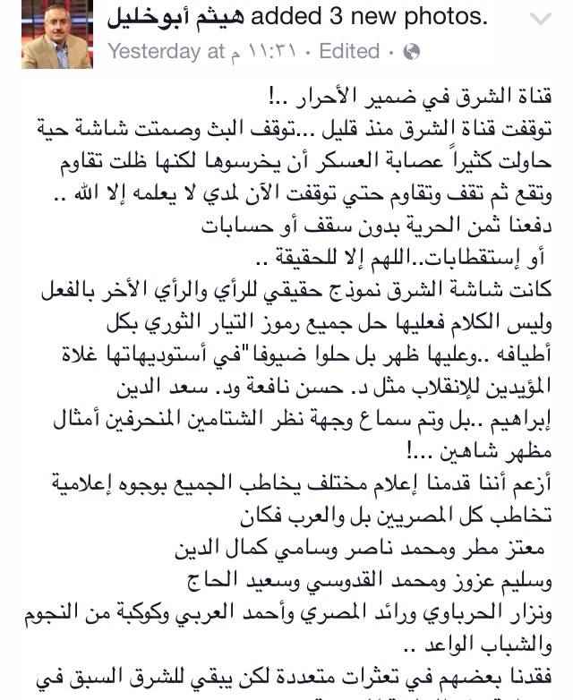 أعلن الناشط الحقوقي ومدير مركز "ضحايا لحقوق الأنسان"، هيثم أبو خليل، والذي عمل مقدم برنامج "حقنا كلنا" في قناة "الشرق"، إغلاق القناة بشكل نهائي، وذلك من خلال بيان رسمي له عبر صفحته الرسمية على موقع التواصل الاجتماعي "فيس بوك"
