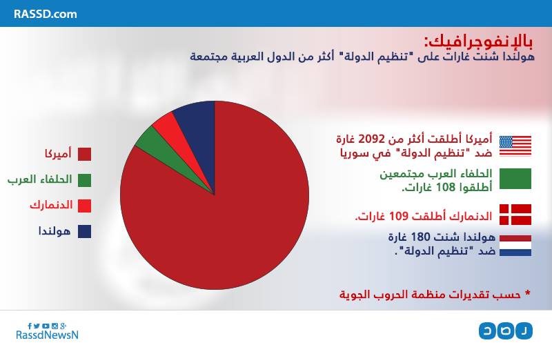 وأضاف “أميركا أطلقت أكثر من 2092 غارة ضد “تنظيم الدولة” في سوريا بحسب الجيش الأميركي، في الوقت الذي أطلق فيه الحلفاء العرب مجتمعين 108 غارات، وبحسب تقديرات منظمة الحروب الجوية فإن الدنمارك أطلقت 109 غارات، أي أكثر من الغارات التي شنها التحالف العربي مجتمعًا، وهولندا شنت 180 غارة ضد “تنظيم الدولة”.