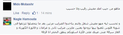 وقد أثارت تلك التصريحات غضب واستياء الكثير من رواد موقع “فيس بوك”، حيث قالت نجلاء حمودة: “وتحسب ليه ما هو مافيش شغل وأنتم بتاخدوا الضرايب مرتين بعد ما بتحصلوا تتزنقوا في شوية فلوس تلعبوا بيها تروحوا باعتين عايزين ضرايب تاني وغرامات وفاتورة الكهرباء والغاز سرقة عيني عينك، على فكرة أسلوبكم ينطق الحجر، أنا قرفت”.