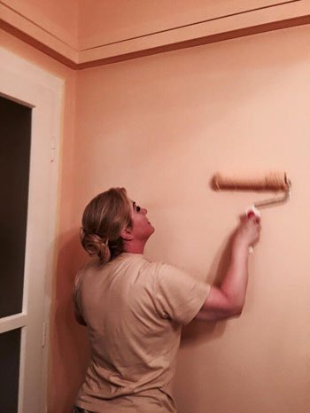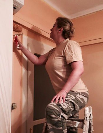 وظهرت “كيتاروفيتش”، في الصور التي نشرتها وهي تمسك بفرشاة الطلاء وتقف فوق سلم خشبي للوصول للأماكن المرتفعة في الجدار.