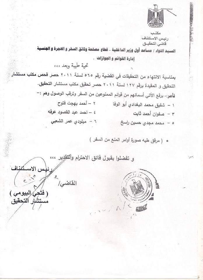 أصدر فتحي البيومي قراراً، مخاطباً مصلحة الجوازات والهجرة، بإلغاء قرار منع كلاً من، شفيق محمد البغدادي أبوالوفا، وأحمد بهجت فتوح، وصفوان أحمد ثابت، وأحمد عبد المقصود عرفه، ومحمد مجدي حسين راسخ، وميلودي عمر الشعبي، من السفر، وذلك بعد التحقيقات في القضية رقم 565 لسنة 2011.