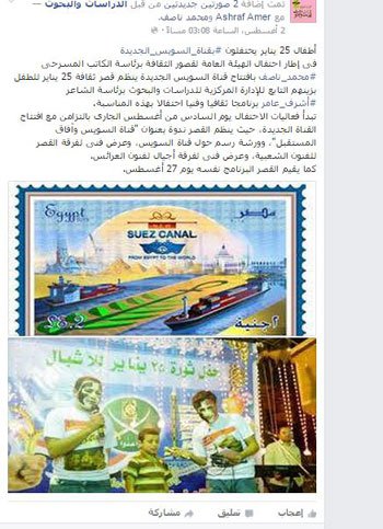 وجاء نص ما كتبته “الإدارة المركزية للدراسات والبحوث” على الصفحة: “في إطار احتفال الهيئة العامة لقصور الثقافة برئاسة الكاتب المسرحي #محمد_ناصف بافتتاح قناة السويس الجديدة، ينظم قصر ثقافة 25 يناير للطفل بزينهم، التابع للإدارة المركزية للدراسات والبحوث، برئاسة الشاعر #أشرف_عامر، برنامجًا ثقافيًا وفنيًا احتفالًا بهذه المناسبة”.