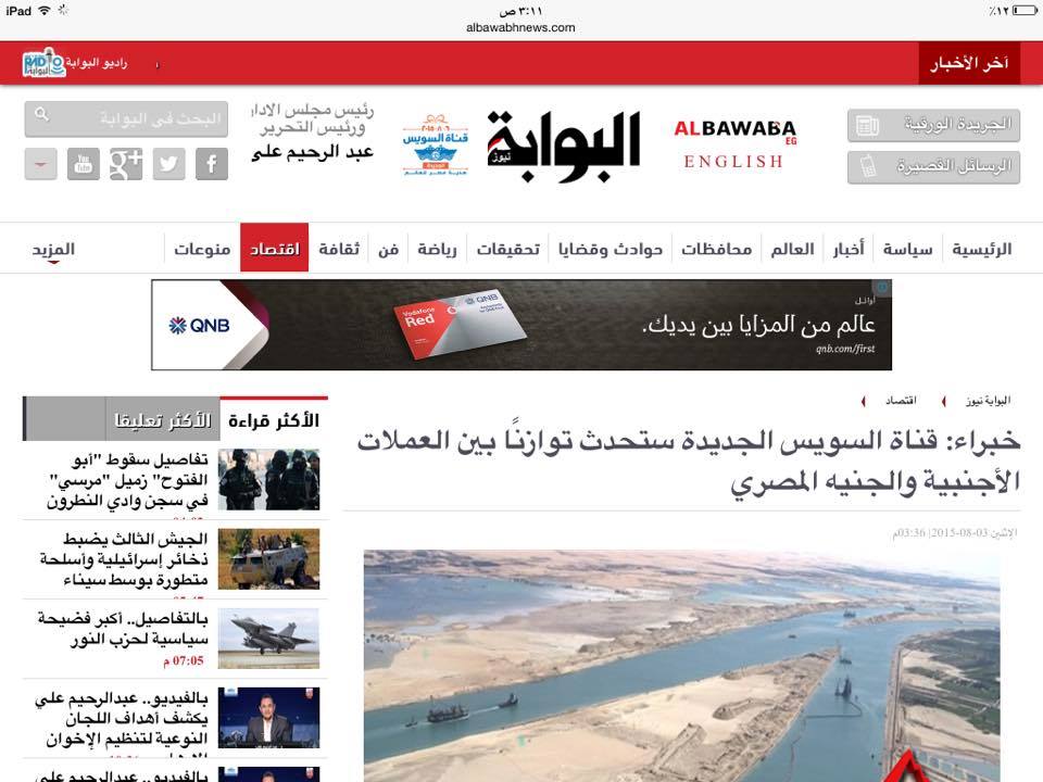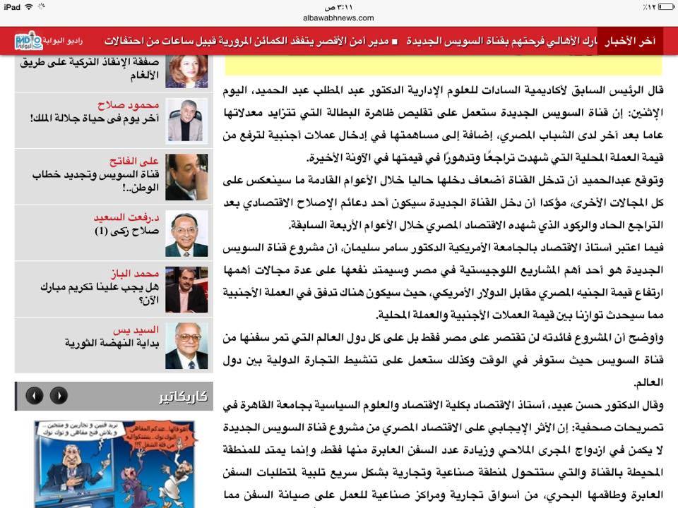 نشرت صحيفة “البوابة نيوز”، الممولة من دولة الإمارات، والتي يرأس تحريرها الصحفي عبدالرحيم علي، المقرب من الأجهزة الأمنية، تصريحًا خاصًا من أستاذ الاقتصاد بالجامعة الأميركية، الدكتور سامر سليمان، المتوفى منذ عام 2012، يتحدث عن أهمية ما يسمى بقناة السويس الجديدة (التفريعة).