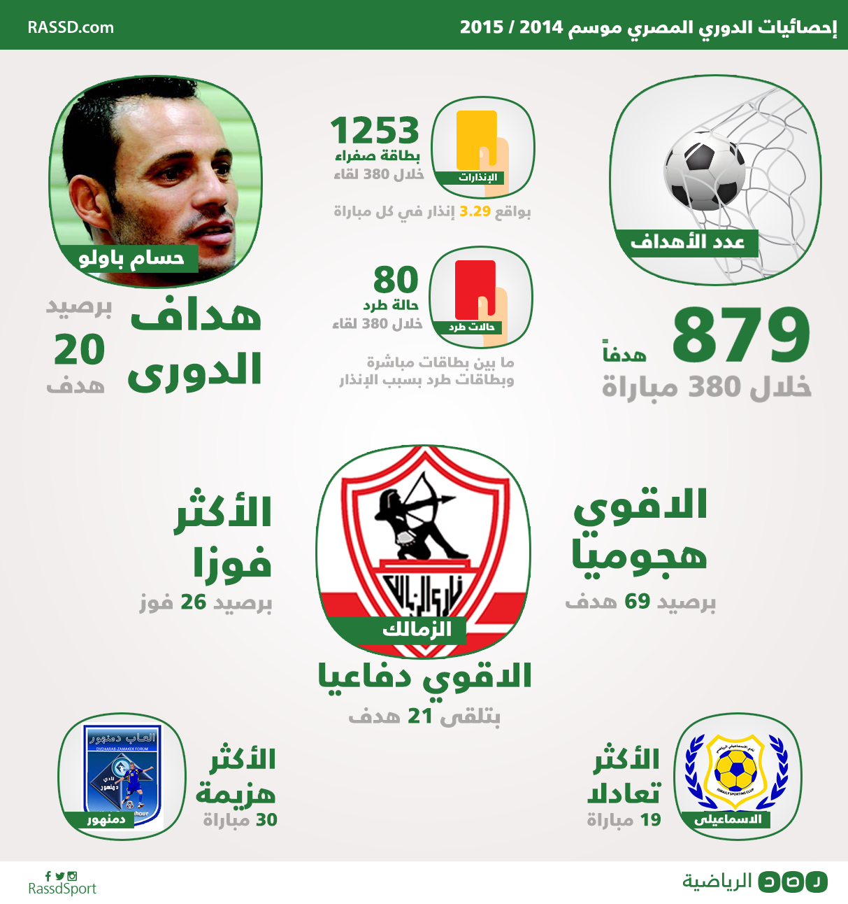 مع انتهاء موسم الدوري المصري 2014- 2015 بفوز نادي الزمالك بدرع الدوري بعد 11 عاما من الغياب، تقدم “رصد” إحصائية دقيقة بالأرقام عن أبرز ما كان يهم المتابع للكرة المصرية خلال الموسم.