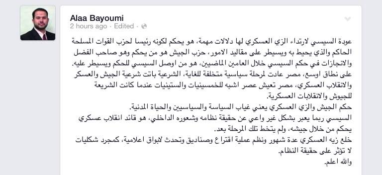 وكتب “بيومي” منشورًا عبر صفحته الرسمية على موقع “فيس بوك”: “على نطاق أوسع، مصر عادت لمرحلة سياسية متخلفة للغاية، الشرعية باتت شرعية الجيش والعسكر والانقلاب العسكري”، مضيفا: “مصر تعيش عصر أشبه بالخمسينيات والستينيات عندما كانت الشرعية للجيوش والانقلابات العسكرية، وحكم الجيش والزي العسكري يعني غياب السياسة والسياسيين والحياة المدنية”.