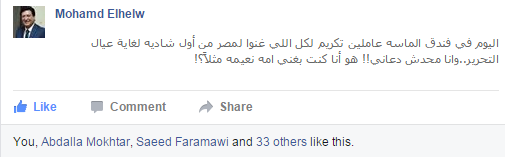 وقال “الحلو” اليوم، عبر صفحته الشخصية على موقع التواصل الاجتماعي “فيس بوك”: “في فندق الماسة عاملين تكريم لكل اللي غنوا لمصر، من أول شادية لحد عيال التحرير، وأنا ماحدش دعاني! هو أنا كنت باغني أمّة نعيمة مثلا؟!!”.