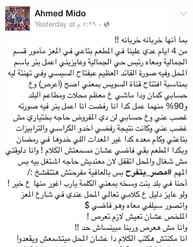 وقال Ahmed Mido في منشوره في “فيس بوك”: “منذ 4 أيام وأنا جالس بمطعمي الموجود بشارع المعز مرّ علينا مأمور قسم الجمالية ومعاه رئيس حي الجمالية وطلبو مني عمل بنر “لافتة” باسم المحل وفيه صورة القائد العظيم عبفتاح السيسي وفي تهنئة ليه بمناسبة افتتاح قناة السويس أو بمعني اصح “أعرص””، على حد قوله.
