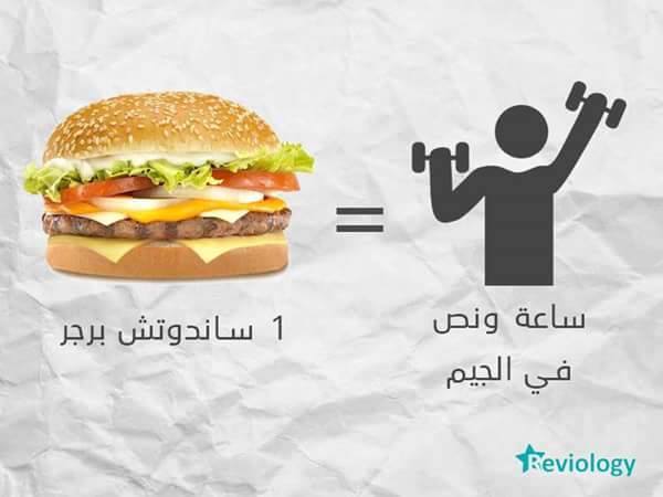 أما المأكولات السريعة، والتي أصبحت الوجبات الرئيسية للكثير، فعلى سبيل المثال ساندويتش واحد من البرجر، يمكنك التخلص من سعراته الحرارية بممارسة التمارين في الجيم لمدة ساعة ونصف الساعة.