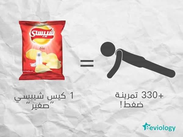 ومن أصعب التمارين التي يواجهها من يريدون التخلص من الوزن الزائد، هو تمرين الضغط، فإذا أردت تناول كيس صغير من الشيبسي، فعليك ممارسة 330 تمرينة ضغط، وكأنك لم تتناوله.