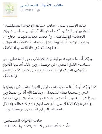 نعى “طلاب جماعة الإخوان المسلمين”، الشهيدين الدكتور “عصام دربالة”، رئيس مجلس شورى الجماعة الإسلامية، و”محمد مهدي مهدي حجاج”، واللذين لقيا حتفهما اليوم في سجون الانقلاب.